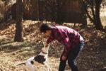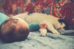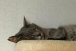 A person petting a sleeping gray kitten