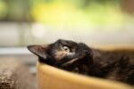 A tortoiseshell cat sleeps curled up on a perch.