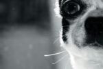 A black and white dog rests on a patterned sofa.